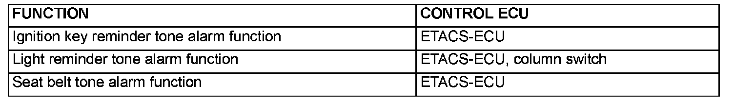 If any of the following conditions is met with the ignition switch at "ON" or "ST", the ETACS-ECU sounds the tone alarm by using the driver's seat belt switch signal and the vehicle speed signal.