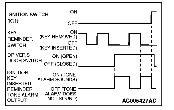 When the driver's door is opened with the ignition key inserted in the ignition key cylinder (ignition switch is in the OFF position,) the tone alarm sounds intermittently (horn sound) to indicate that the ignition key has not been removed.
