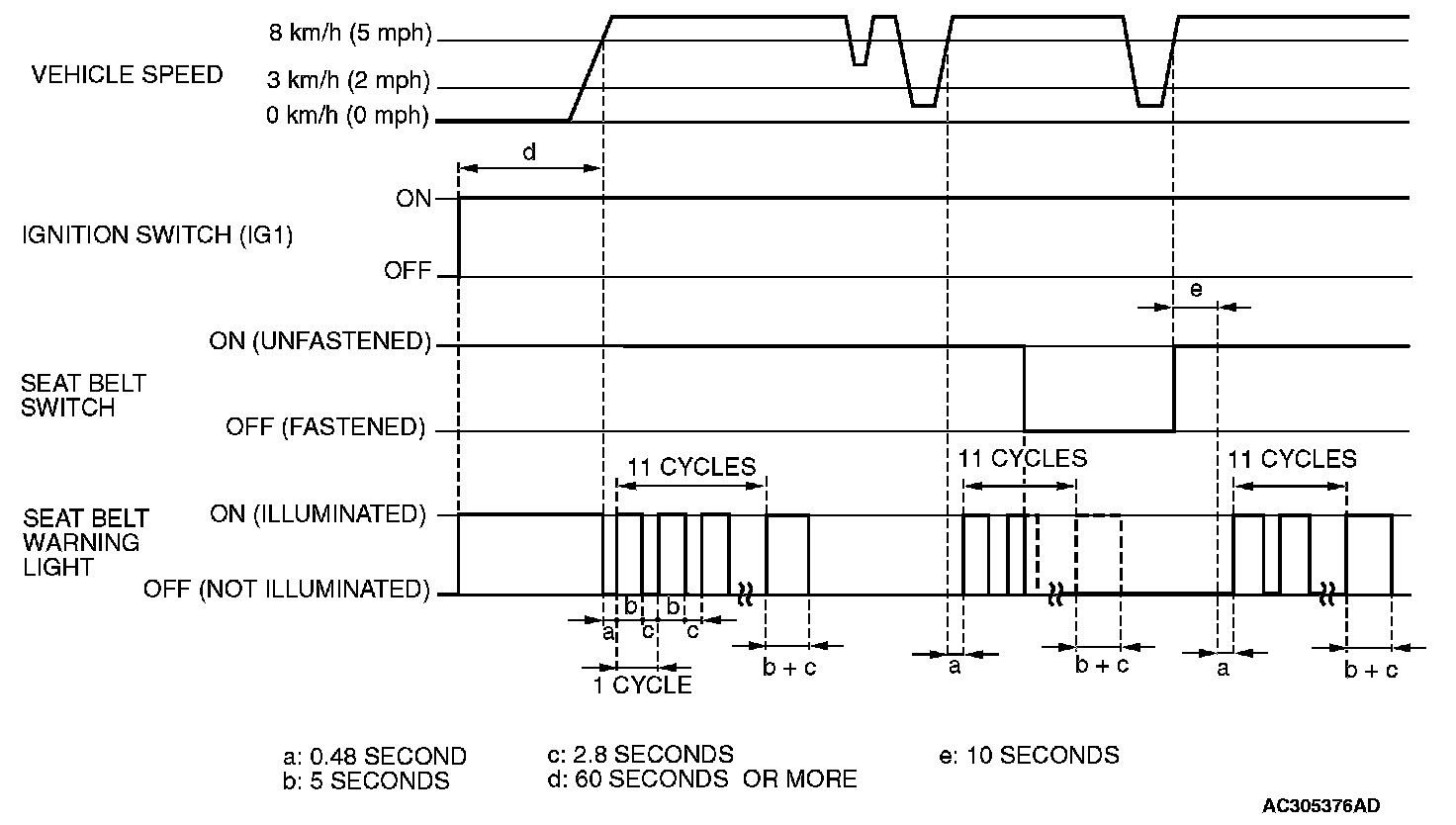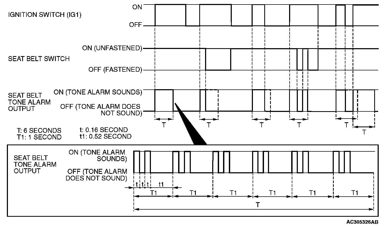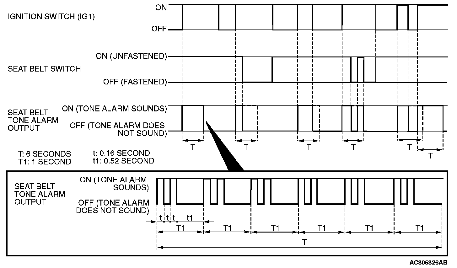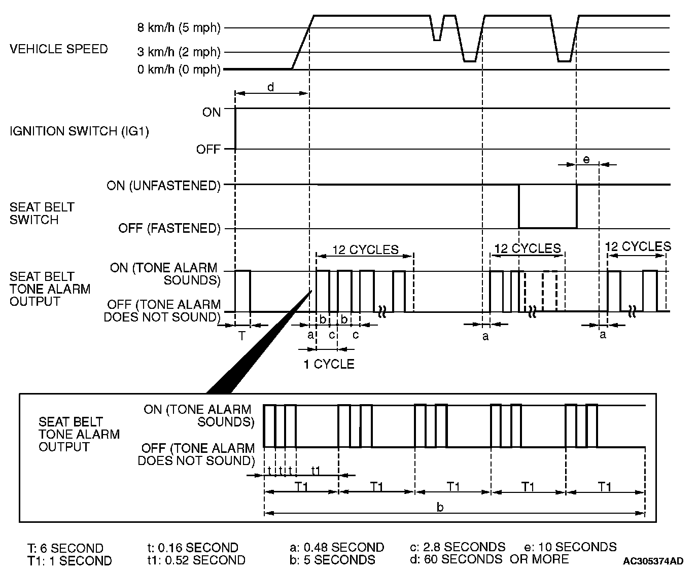 - Sounds the tone alarm 12 cycles (after 0.48 seconds) if any of the following conditions is met when 60 seconds or more have elapsed since the ignition switch is turned "ON". One cycle consists of 5 seconds "on" and then 2.8 seconds "off".