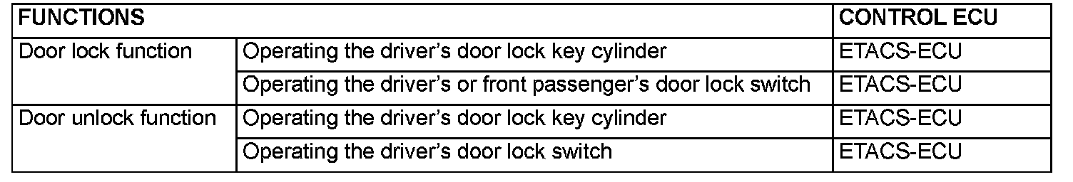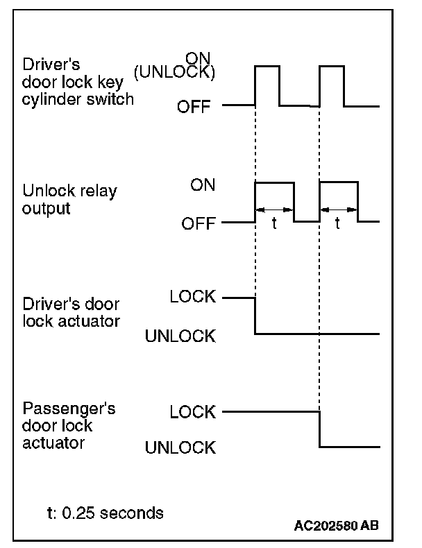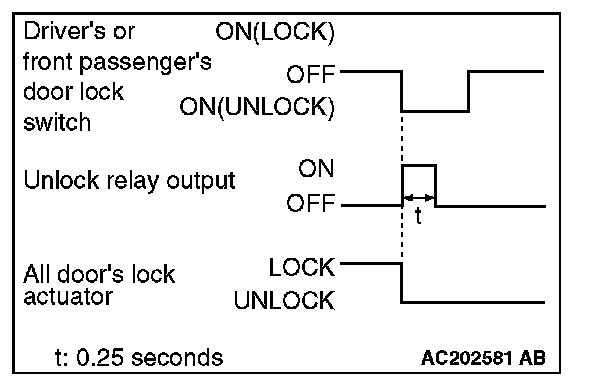 When the door is unlocked by driver's or front passenger's door lock switch, the ETACS-ECU energizes its door unlock relay for 0.25 second to activate all the door lock actuators. Then all the doors will be unlocked.