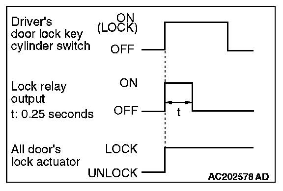 When you insert the ignition key to the driver's door lock key cylinder and turn the key clockwise to lock the door, the ETACS-ECU energizes its door lock relay for 0.25 second to activate all the door lock actuators. Then all the doors will be locked.