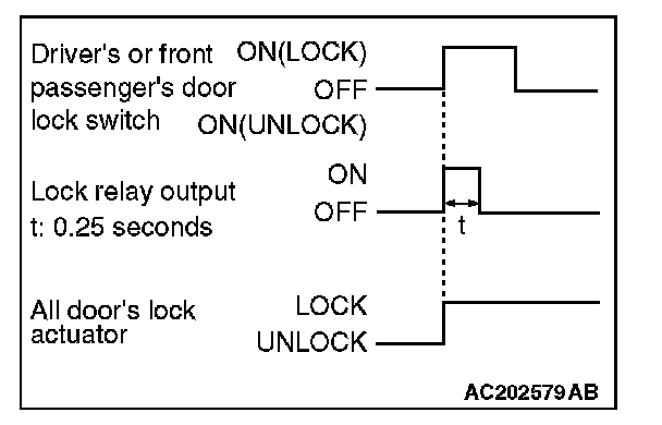 When the door is locked by driver's or front passenger's door lock switch, the ETACS-ECU energizes its door lock relay for 0.25 second to activate all the door lock actuators. Then all the doors will be locked.