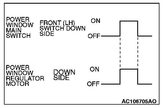 When the front (LH) switch on the power window main switch is pushed down fully, the system energizes its respective power window regulator motor, and then the driver's window glass moves to its lowest position.