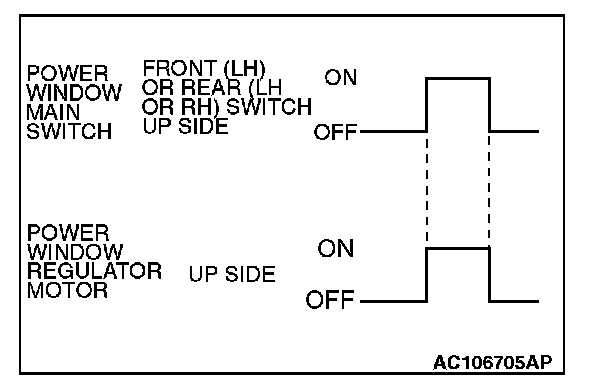 When the power window sub switch (FRONT) or power window sub switch (REAR: LH or RH) is pulled up, the system energizes its respective power window regulator motor, and then the passenger's or rear door window glass rises.