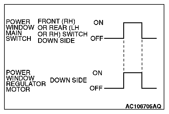 When the front (RH) or rear (LH or RH) switch on the power window main switch is pushed down, the system energizes its respective power window regulator motor, and then the passenger's or rear door window glass lowers.