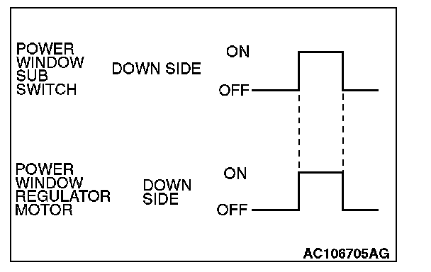 When the power window sub switch (front) or power window sub switch (REAR: LH or RH) is pushed down, the system energizes its respective power window regulator motor, and then the passenger's or rear door window glass lowers.