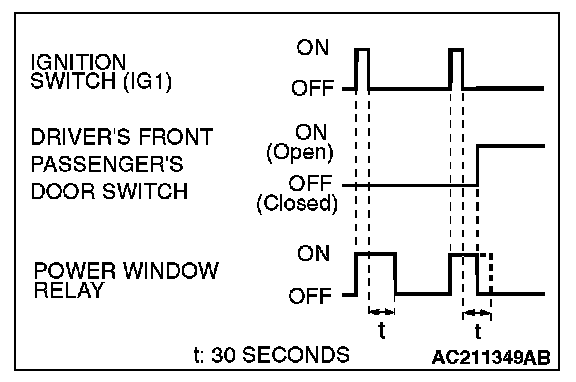 When the ignition switch is turned to the "ON" position, the power window relay is turned ON. After the ignition switch is turned OFF, the system continues to turn ON the power window relay for about 30 seconds and to enable the opening and closing of the door window by the power window switch. When the driver's or front passenger's door is opened while the timer is in operation, the power window relay will be turned OFF.