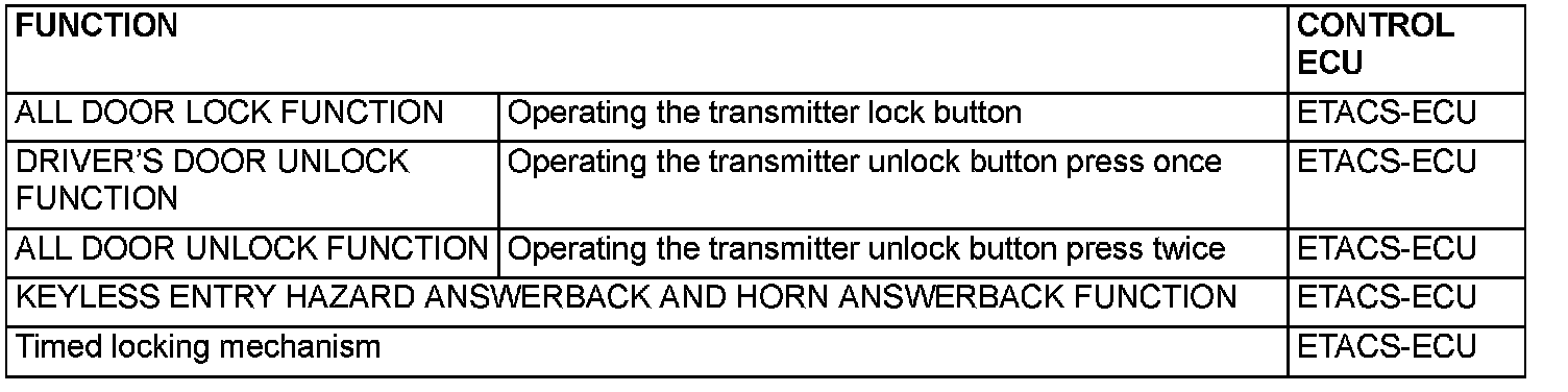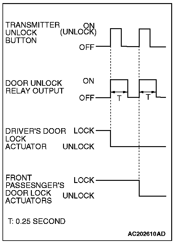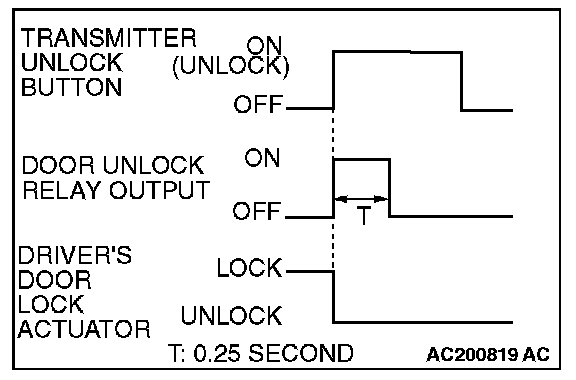 When the transmitter unlock button is pressed twice, the ETACS-ECU energizes its door unlock relay to operate the driver's door lock actuator and the other door lock actuators for 0.25 second each in succession. Then, the doors will be unlocked.