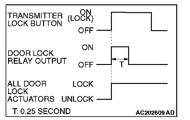 When the transmitter lock button is pressed, the ETACS-ECU energizes its door lock relay to operate all the door lock actuators for 0.25 second thus causing all doors to be locked.