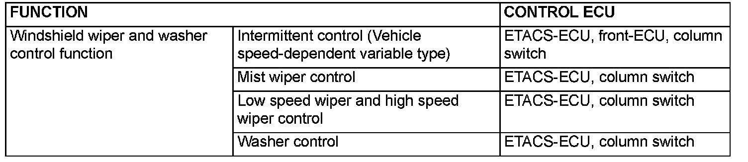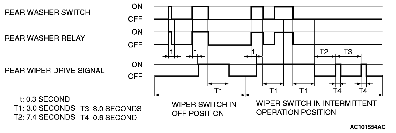 When the ignition switch is at the ACC or ON position, if the rear washer switch is turned ON, the ETACS-ECU turns ON the rear washer relay. The rear wiper drive signal is turned ON in 0.3 seconds until 3.0 seconds after the rear washer switch goes OFF to operate the rear wiper continuously.