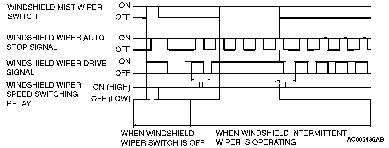 When the windshield mist switch is turned on briefly, the wiper operates at low speed once. At the point the windshield mist switch is turned ON, if the windshield wiper has been operating intermittently, the same operations as the above will be performed while the windshield mist wiper switch is ON. After the windshield mist wiper switch goes OFF, the intermittent operations will be set again l second after the windshield wiper auto-stop signal is turned ON last.