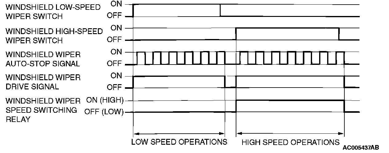 When the ignition switch is at the ACC or ON position, if the windshield low speed wiper switch is turned ON, the front-ECU turns ON the windshield wiper drive signal, turns OFF (LOW) the windshield wiper speed switching relay, and operates the windshield wiper at low speed. Next, when the windshield high speed wiper switch is turned ON, the windshield wiper drive signal is turned ON, the windshield wiper speed switching relay is turned ON (HIGH), and the windshield wiper is operated at high speed.