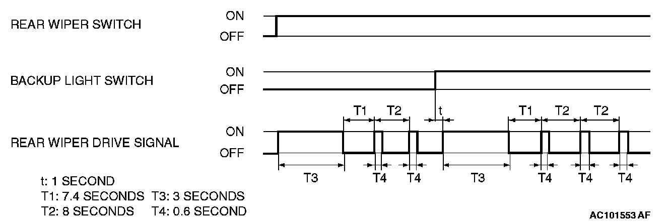 If the rear wiper switch is turned ON with the ignition switch in the ACC or ON position, the ETACS-ECU will turn the rear wiper drive signal ON for 3 seconds (approximately 2 operations), and then will carry out intermittent operation in a 7.4 to 8 seconds cycle.