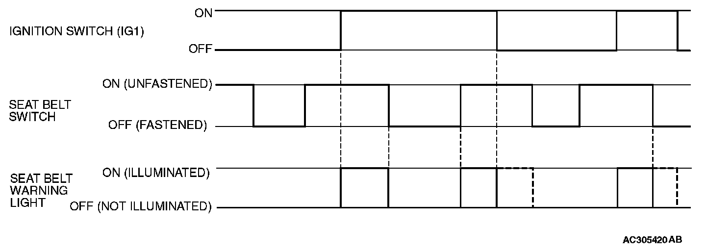 If any of the following conditions is met with the ignition switch at "ON" or "ST", the ETACS-ECU illuminates or extinguishes the seat belt indicator by using the driver's seat belt switch signal and the vehicle speed signal.