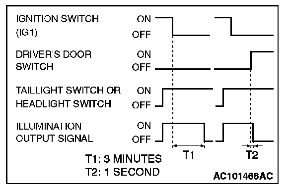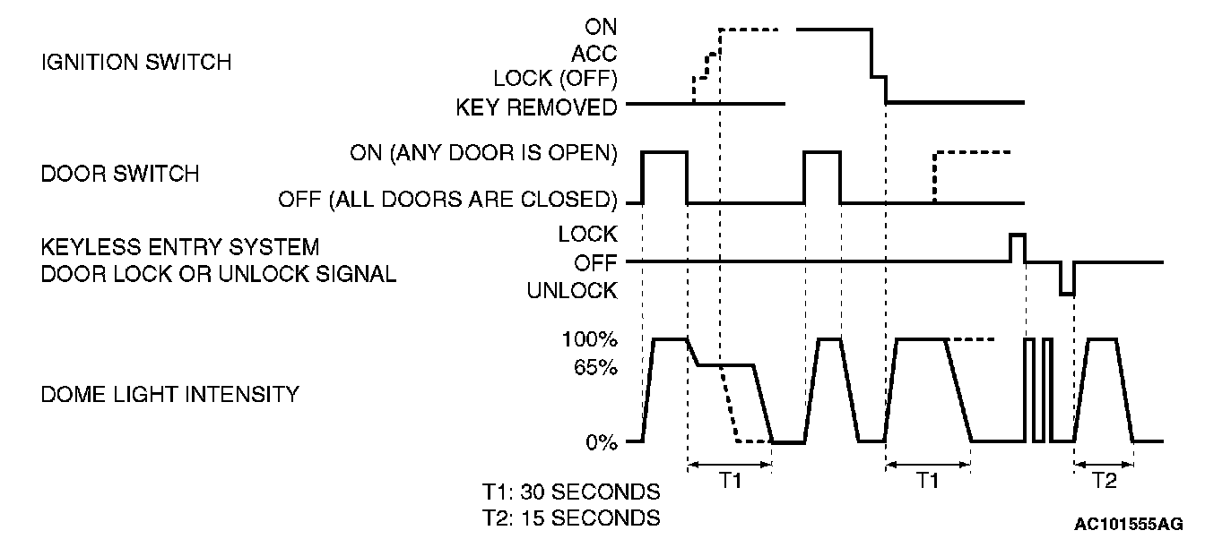 NOTE: The dotted lines indicate that lighting mode when the ignition switch is turned ON, all doors are locked during the timer illumination time.