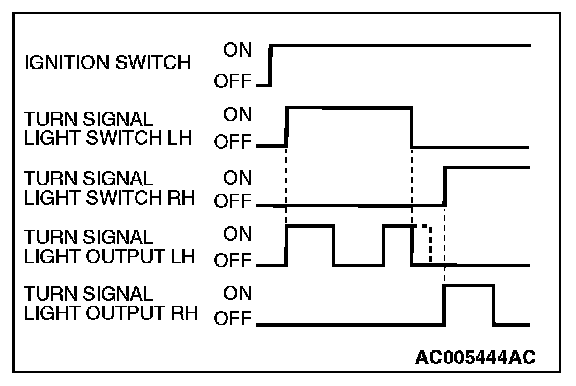 The turn-signal light output (flashing signal) is turned ON when the turn-signal light ignition switch is ON and the turn-signal light switch is ON (LH or RH.) If the front turn-signal light or rear turn-signal light bulb has burned out, the flashing speed increases to indicate that the bulb has burned out.