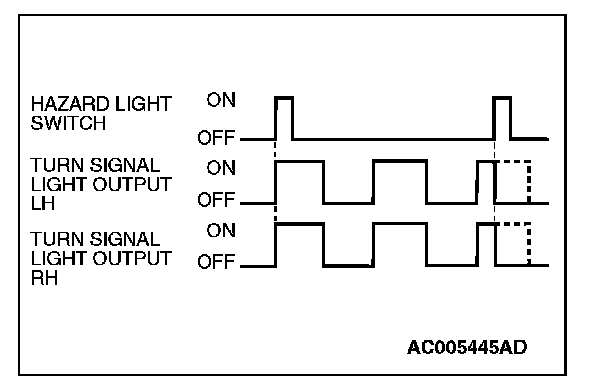 The hazard warning lights output (flashing) is turned ON when the hazard switch is turned OFF to ON. When the switch is turned ON again, the output is turned OFF.