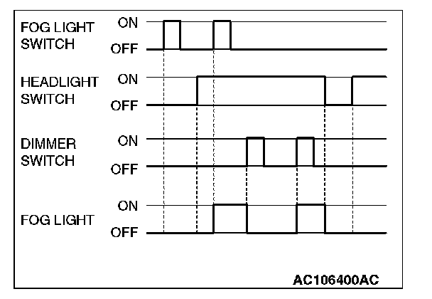 NOTE: This description covers the fog lights only. In actual driving, the fog lights may be turned off due to the headlight automatic shut-down function. For the details on the headlight automatic shut-down function, Refer to General Description Concerning the Headlight and Taillight