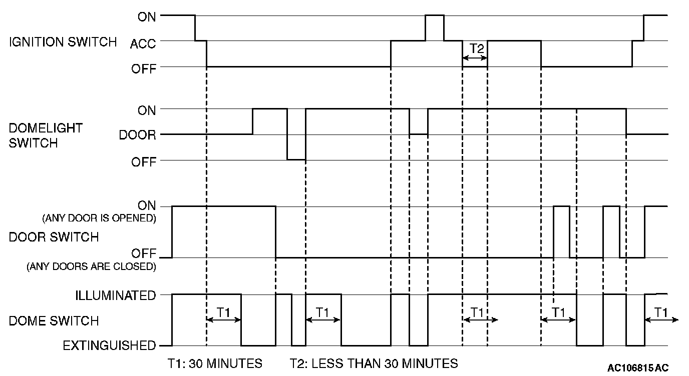 Illuminated interior lights such as the front dome light, etc. (all lights using the dome light fuse as the power supply) will automatically go off in the following conditions to prevent excess battery discharge as a result of forgetting to turn off the lights or incomplete closing of the door.