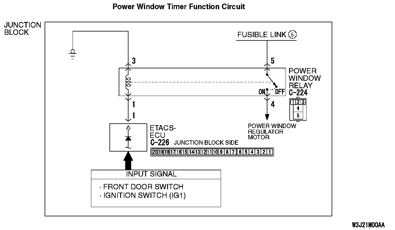 If the power window timer function does not work normally, its input circuit, the ETACS-ECU or the front-ECU may be defective.