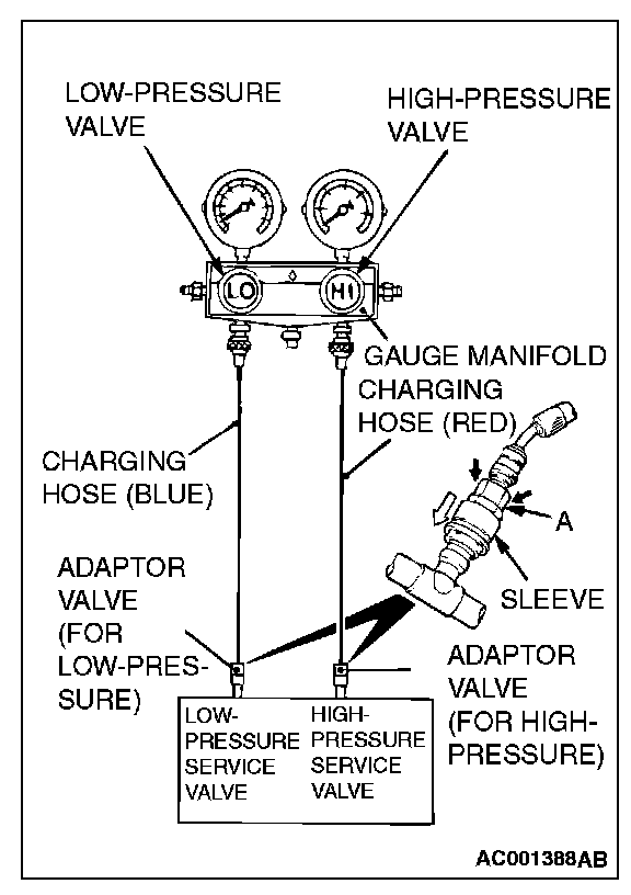 NOTE: The high-pressure service valve is on the liquid pipe A and the low-pressure service valve is on the suction hose.