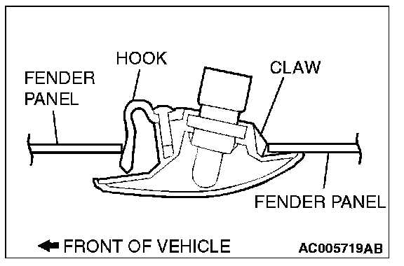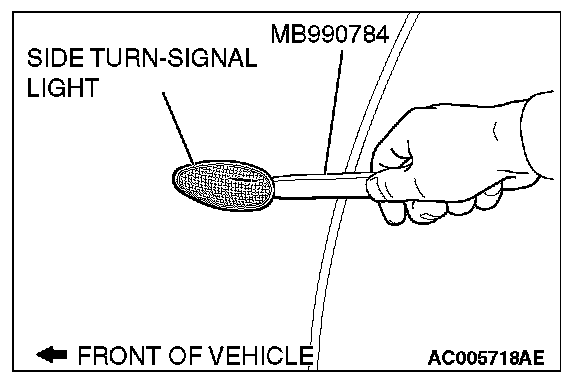 Use special tool MB990784, etc. to press and deflect the hook to vehicle front from fender, and unhook the pawls to remove the side turn-signal light.