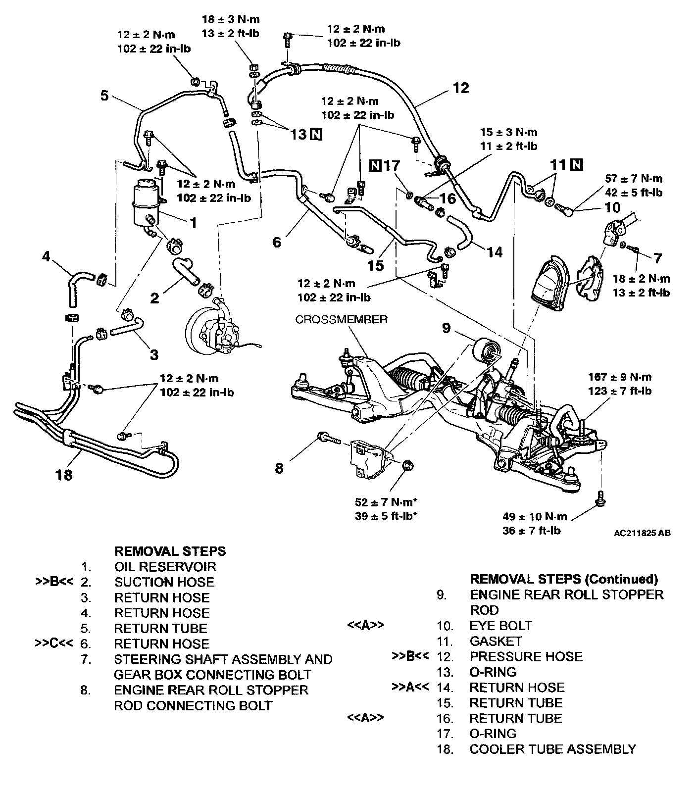 1. Loosen the crossmember mounting bolts and nuts, and lower the crossmember to a position so that the eye bolts or return tube at the steering gear side can be removed.