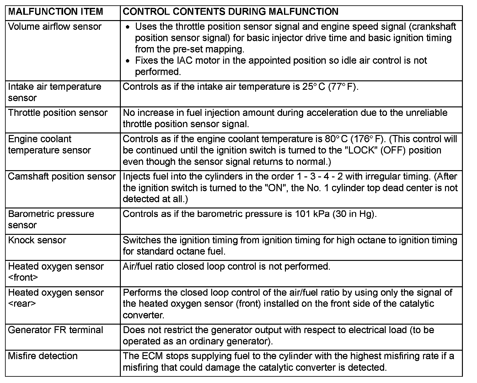 When the main sensor malfunctions are detected by the diagnostic test mode, the vehicle is controlled by means of the defaults.