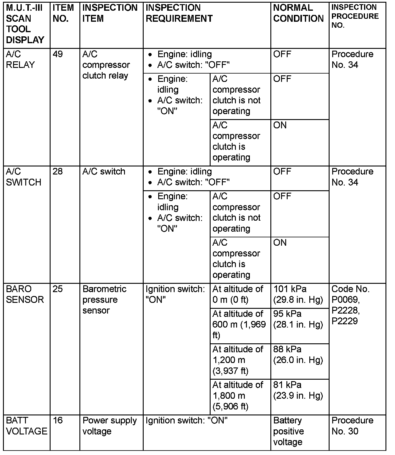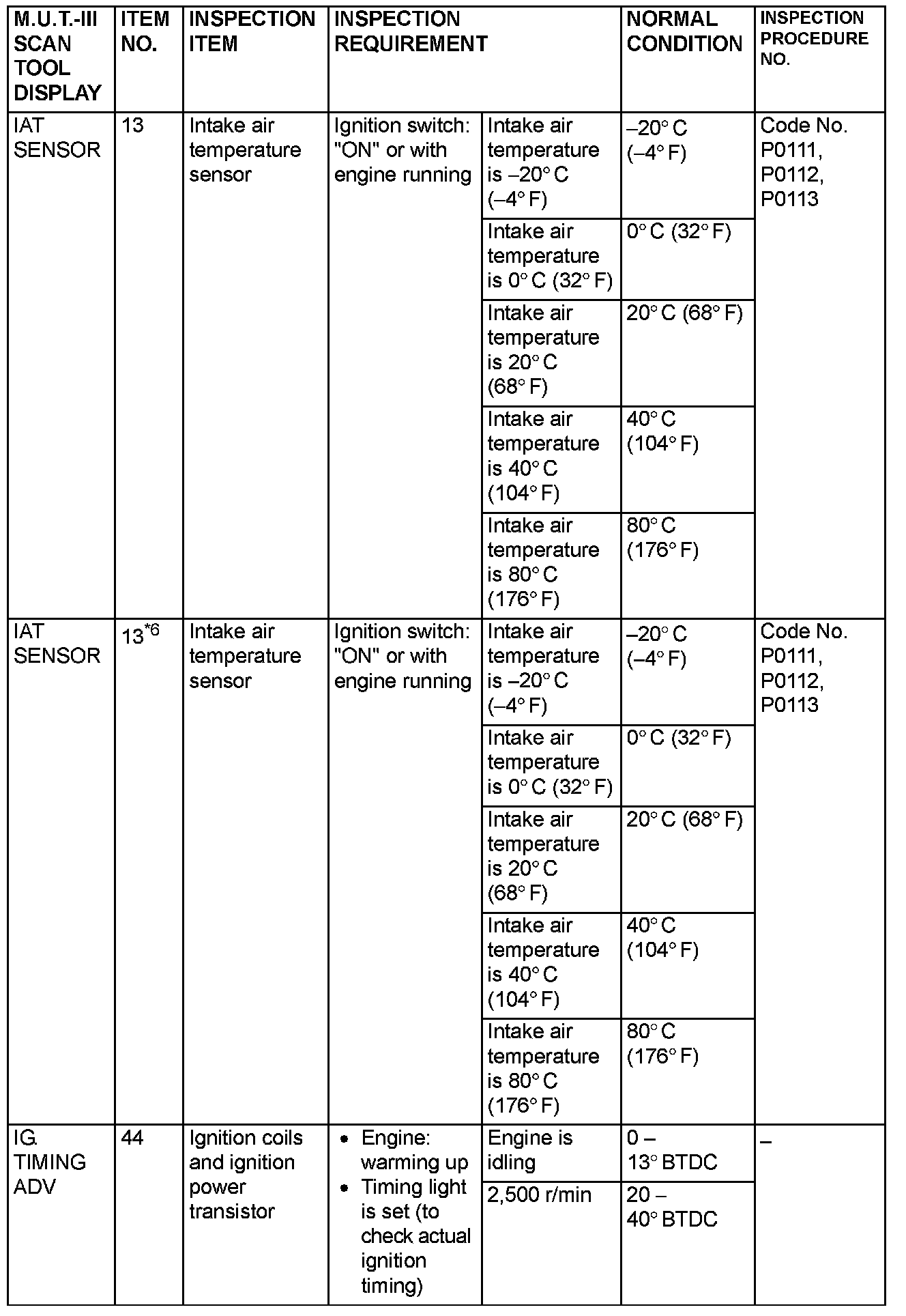 NOTE: *6: GST items. [Data list items consist of M.U.T.-III items and GST items. GST items can be accessed through the use of a general scan tool (GST). When scan tool MB991958 (M.U.T.-III sub assembly) is used, M.U.T.-III items appear alphabetically; then, GST items appear alphabetically. The black and white characters of the GST items are inverted from the M.U.T.-III items.]