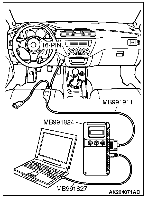 CAUTION: To prevent damage to scan tool MB991958, always turn the ignition switch to the "LOCK" (OFF) position before connecting or disconnecting scan tool MB991958.
