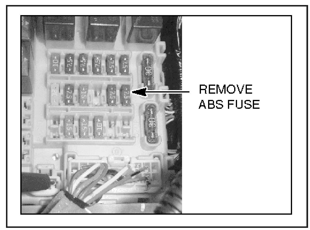 Models equipped with ABS: With the ignition key OFF, unplug the ABS fuse (7.5 amp # 12 fuse in the junction box compartment).