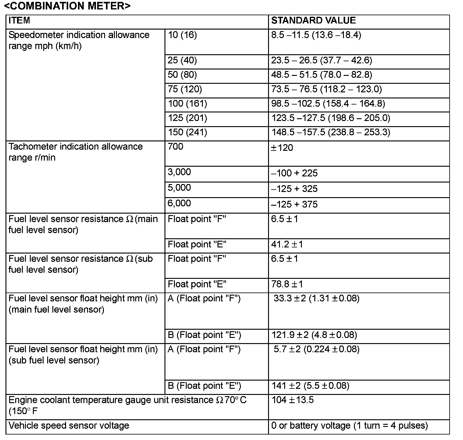 Service Specifications - Combination Meter: