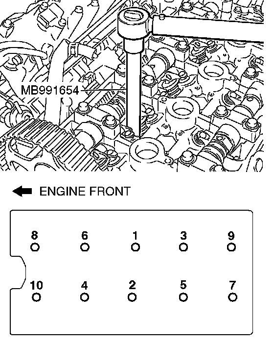 Use special tool MB991654 to tighten the cylinder head bolts as follows: