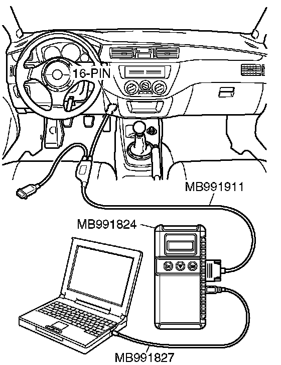CAUTION: To prevent damage to scan tool MB9911958, always turn the ignition switch to the "LOCK" (OFF) position before connecting or disconnecting scan tool MB9911958,
