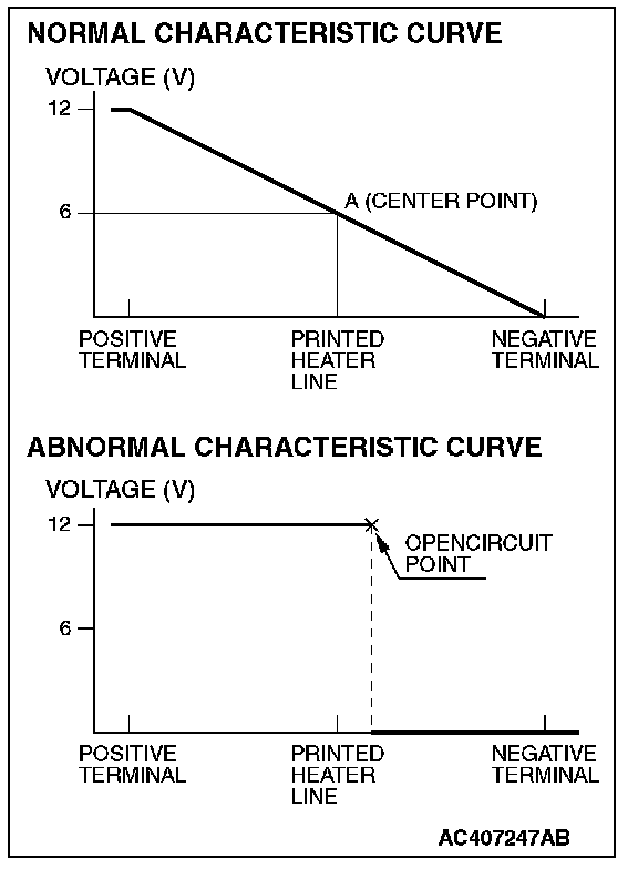 2. Turn "ON" rear window defogger switch. Measure heater element voltage with circuit tester at rear window glass center A. Condition is good if it indicates about 6 V.