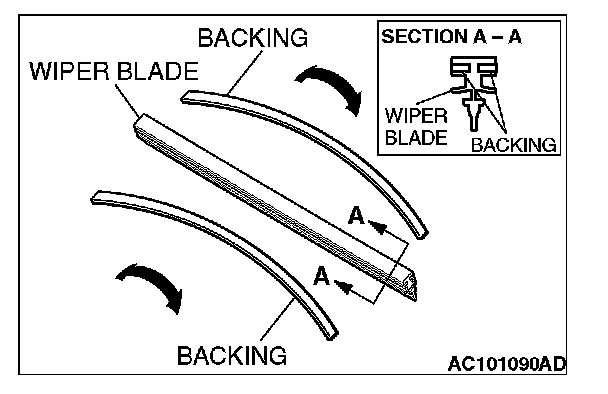 CAUTION: Ensure that the backings are bent in the shown direction, and then install the backings to the wiper blade.