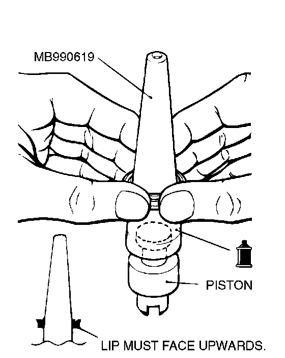 CAUTION: In order to keep the piston cup from becoming twisted or slanted, slide the piston cup down special tool MB990619 slowly and carefully, without stopping.