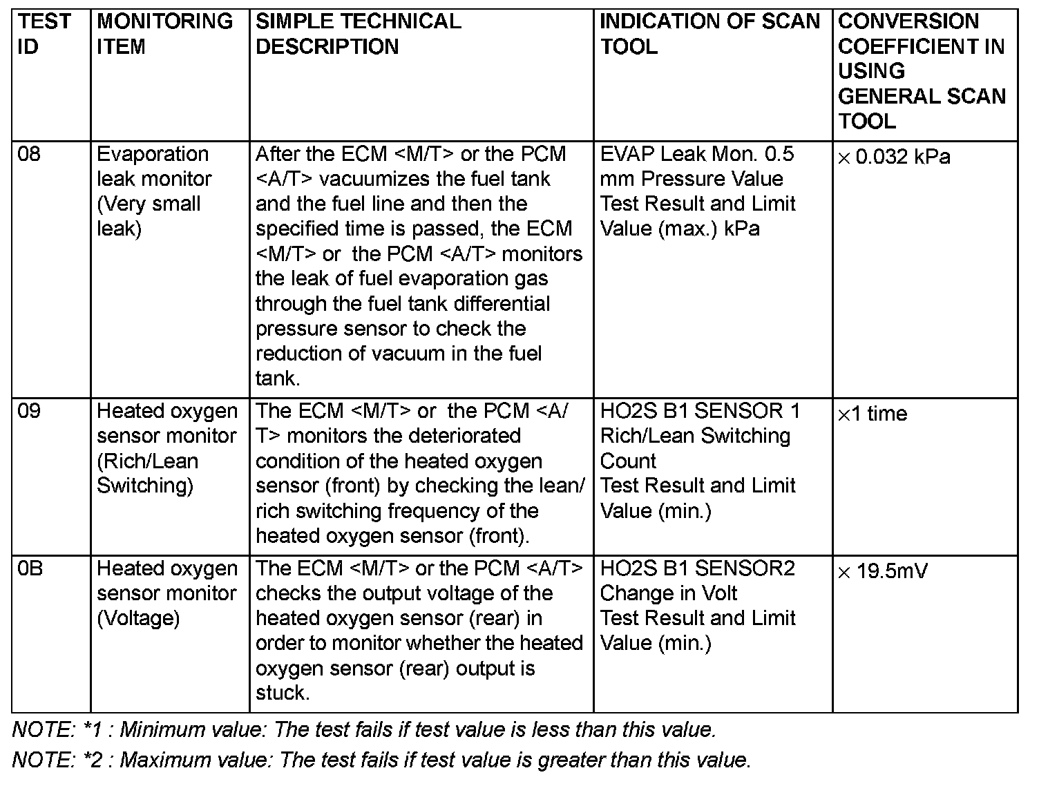 By selecting MODE 6 using scan tool, Test Result and Limit Value (minimum) *1 or (maximum) *2 about the main items of emission control system which ECM or the PCM