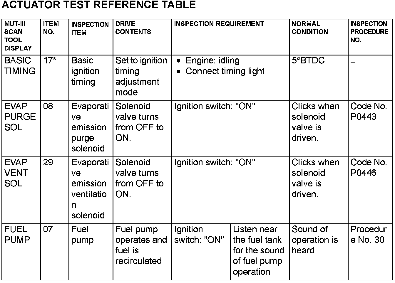 Actuator Test Reference Table