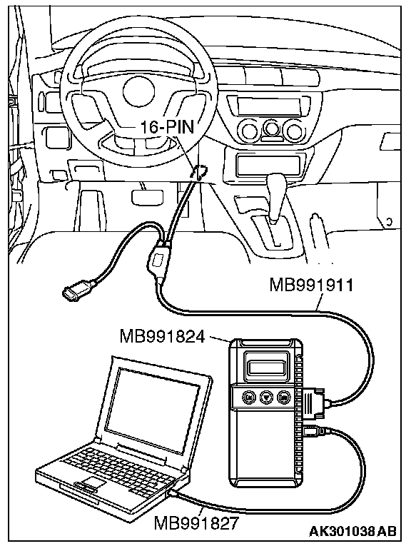 CAUTION: To prevent damage to scan tool MB991958, always turn the ignition switch to the "LOCK" (OFF) position before connecting or disconnecting scan tool MB991958.