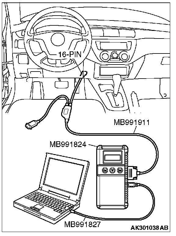 CAUTION: To prevent damage to scan tool MB991958, always turn the ignition switch to the "LOCK" (OFF) position before connecting or disconnecting scan tool MB991958.