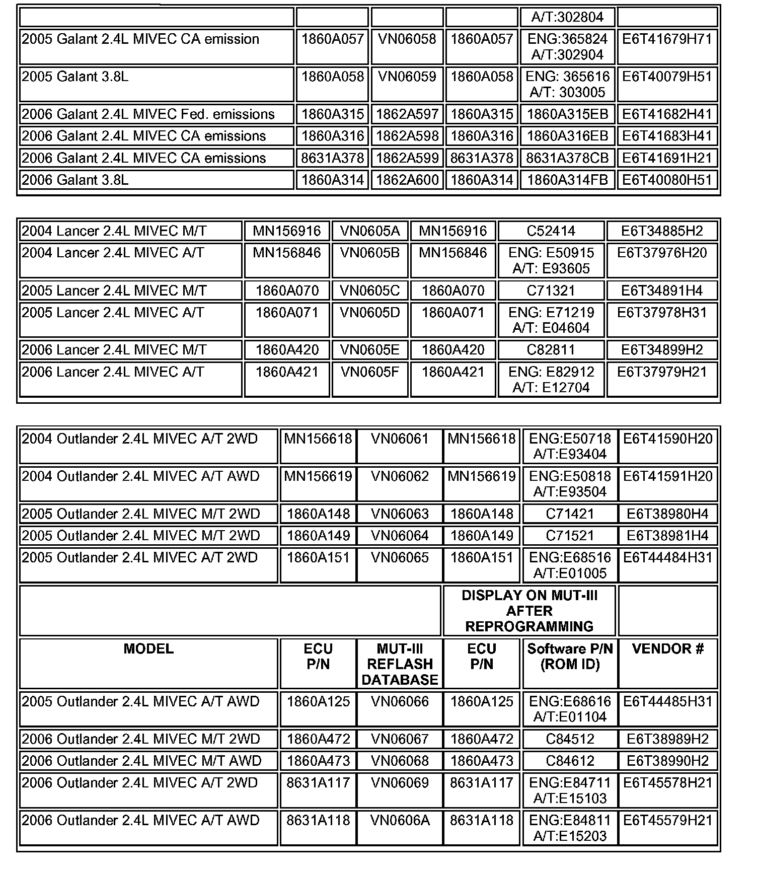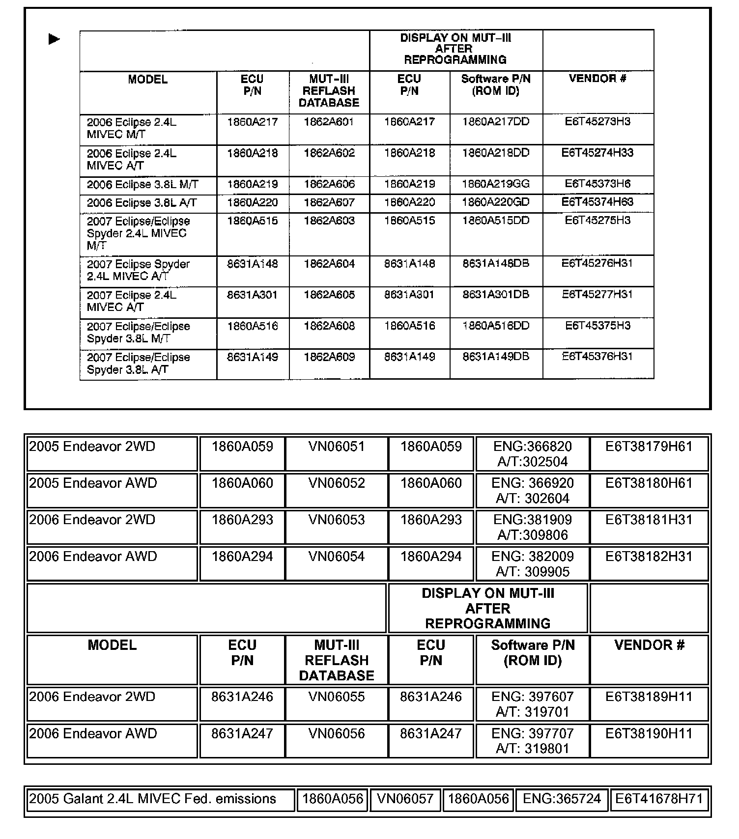 2. Using the MUT-III, verify that the vehicle's ECU part number is listed in the table in Step 9. If the Software P/N is the same as or higher than the Software PIN in the table, the PCM has already been reprogrammed for this concern. Do not continue with this bulletin procedure. Refer to Group 13 in the appropriate service manual to diagnose the DTC.