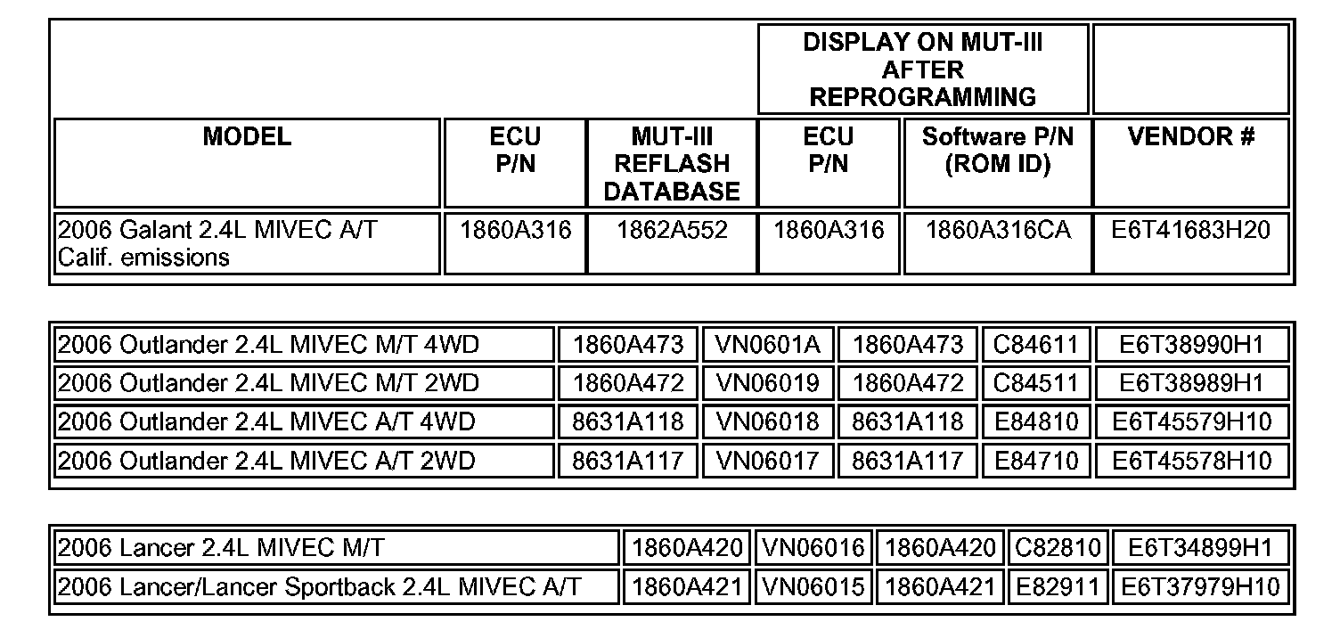 2006 Lancer, Lancer Sportback, and Outlander models equipped with 2.4L MIVEC engine