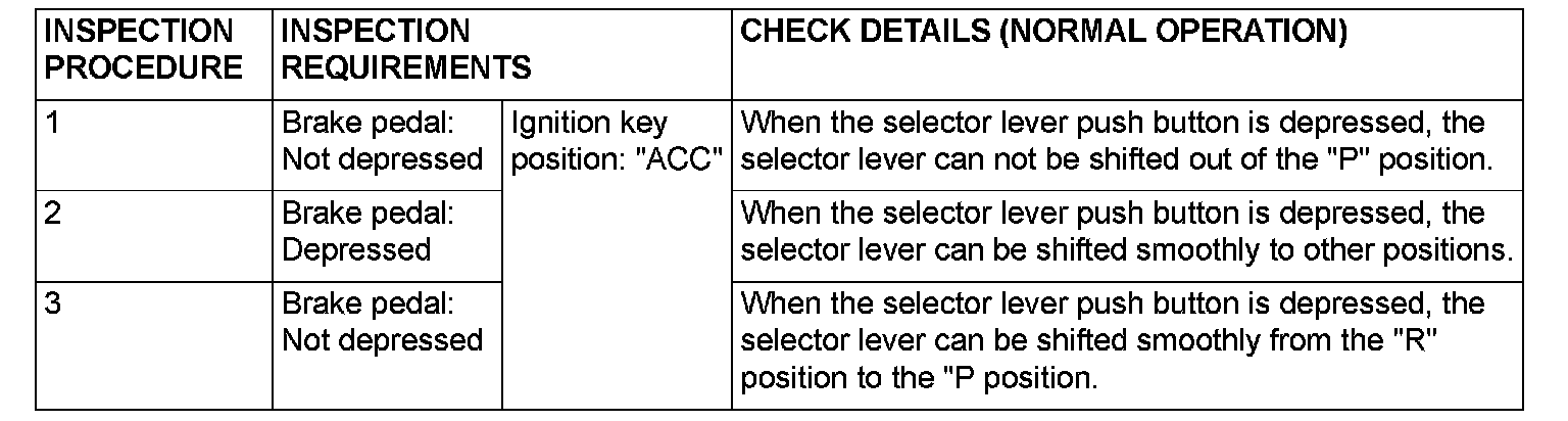 5) After adjusting, retest the shift lock cable operation. Replace the shift lock cable if it does not operate properly.