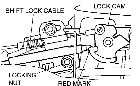 4) Adjust the cable so that the end of the shift lock cable is above the red line on the lock cam and tighten the locknut.