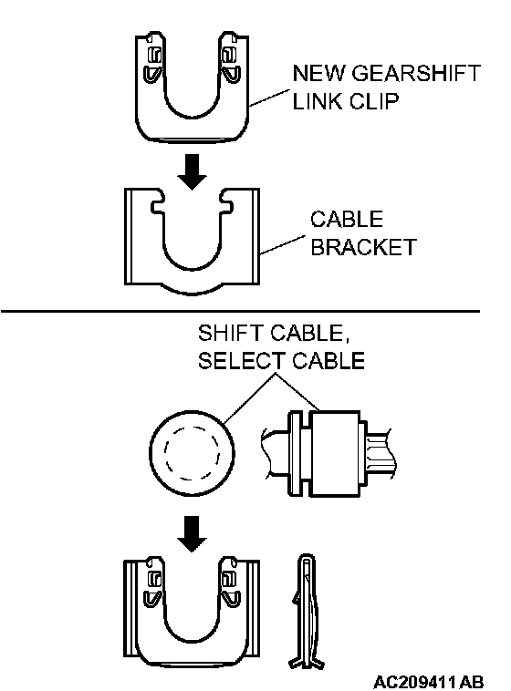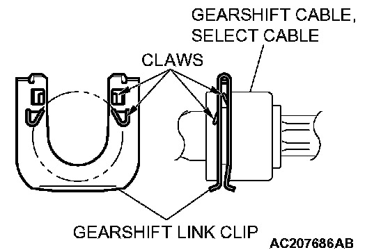 CAUTION: Insert thoroughly the gearshift link clip, shift cable and select cable until they click in place.