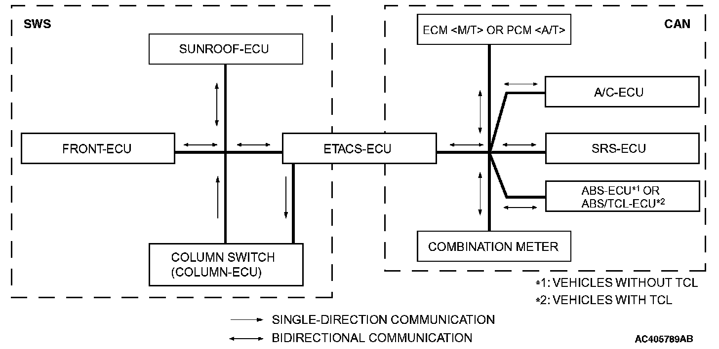 As shown in the figure, SWS communications connect the ETACS*1-ECU, the column switch (in the column-ECU), the front-ECU, and the sunroof-ECU. CAN*2*3 communications connect the ETACS-ECU, the engine control module (ECM)