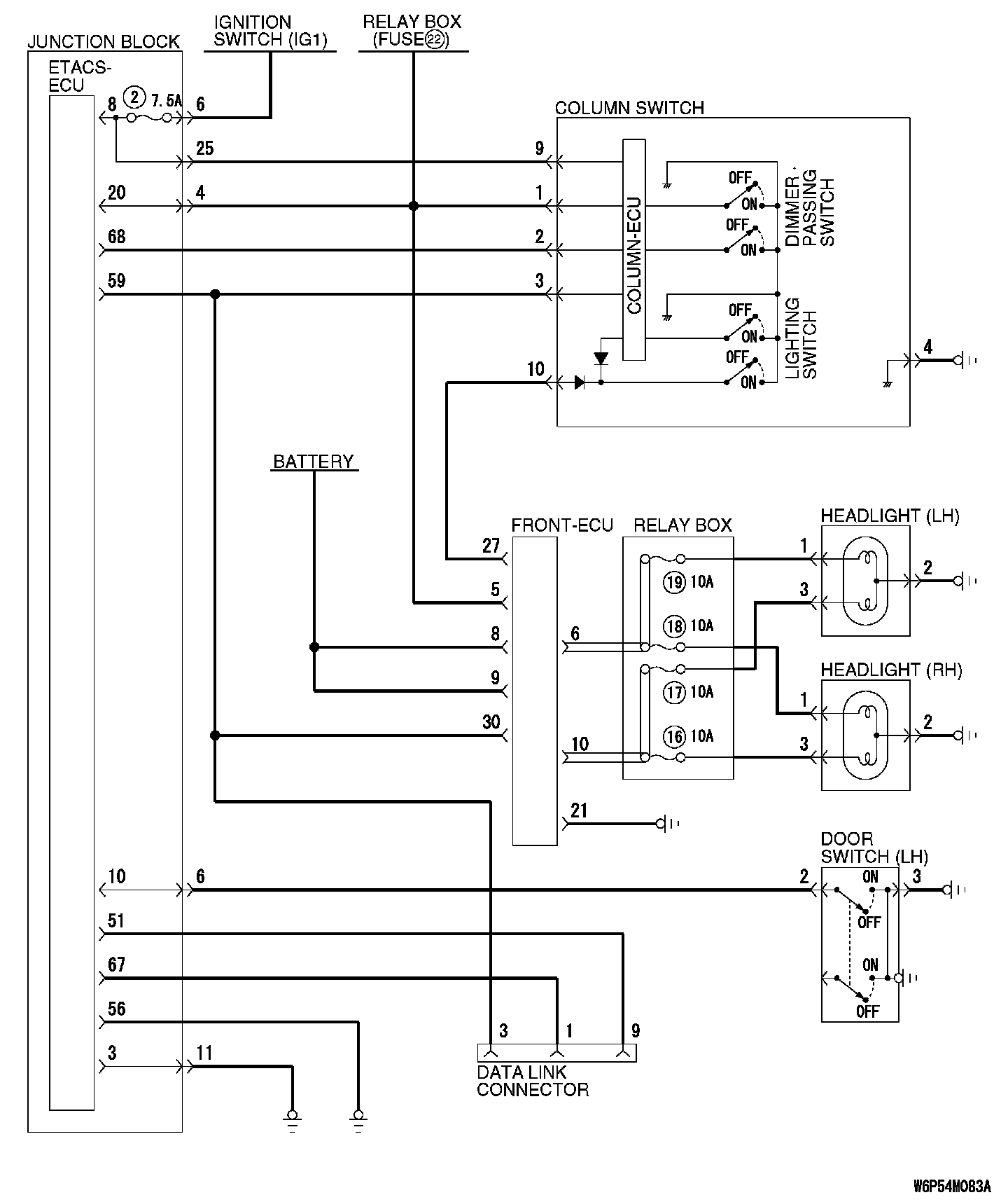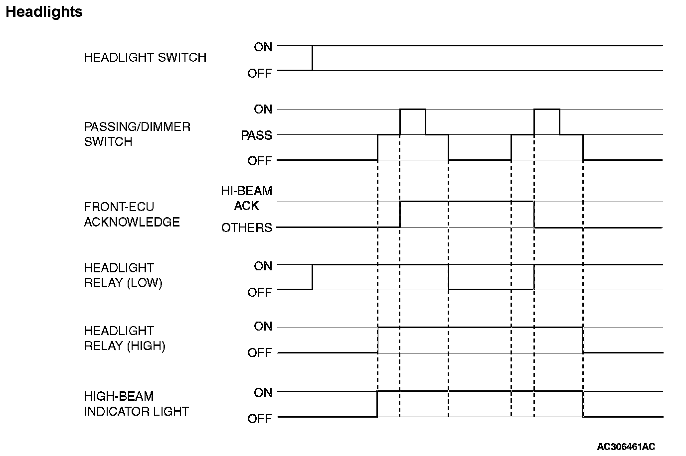 If the column switch sends a headlight switch "ON" signal to the front-ECU, the front-ECU turns on its headlight relay (LOW), causing the low-beam headlights to illuminate. If the dimmer switch is turned on while the headlight relay (LOW) is on, the front-ECU turns on the headlight relay (HIGH), causing the high-beam headlights to illuminate.