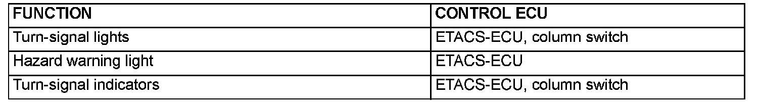 At the same time that the turn-signal lights are illuminated, the ETACS-ECU sends a signal to illuminate the turn-signal light indicator via the CAN bus line. The combination meter receives the transmitted signal and turns the turn-signal light indicator on and off.