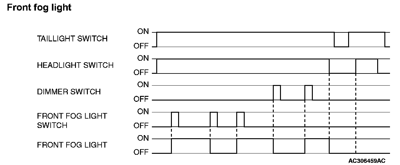 The front fog lights will be switched off when any of the following conditions are met. The front fog lights will also be switched off automatically by headlight automatic shutoff function.